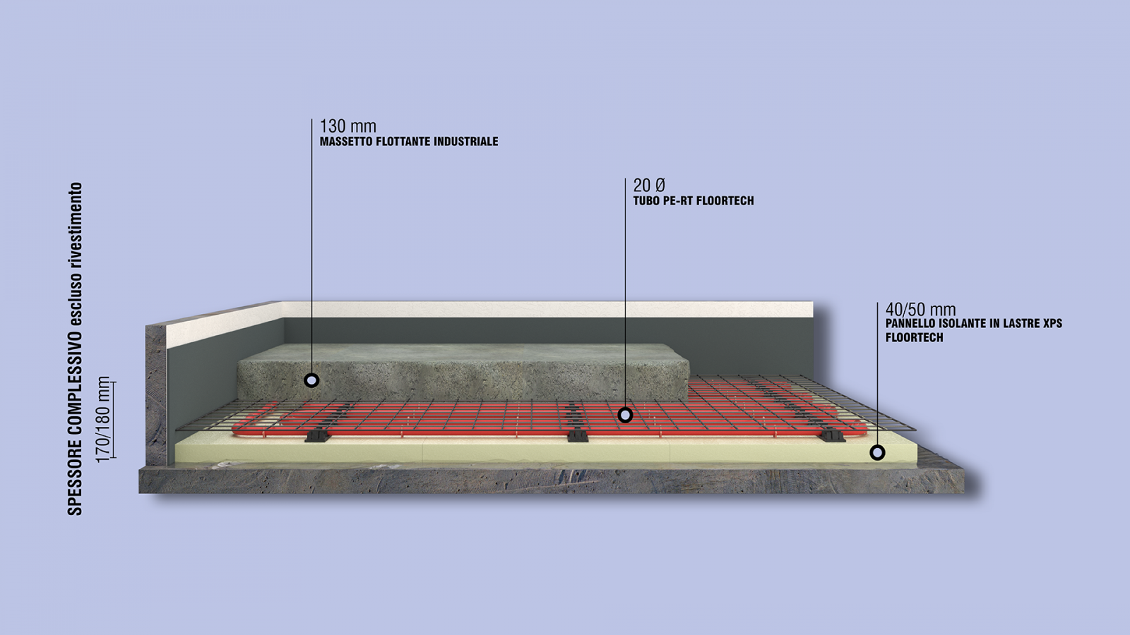 Considerando un massetto di 130 mm, lo spessore minimo che si può ottenere con un sistema XPS industriale è di 170 mm (eventuale rivestimento escluso).