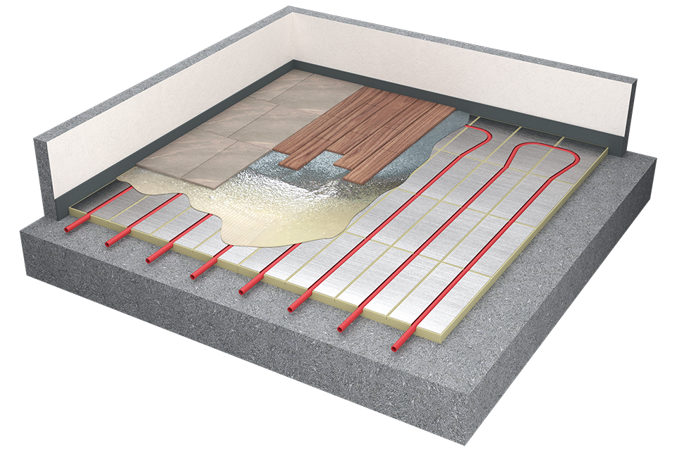 E' composto da pannelli in poliuretano ad alta densità, sulla superficie sono incollate delle lamelle in alluminio puro sagomate per il contenimento della tubazione e la distribuzione del calore.