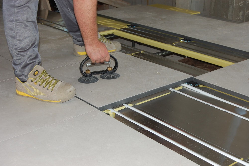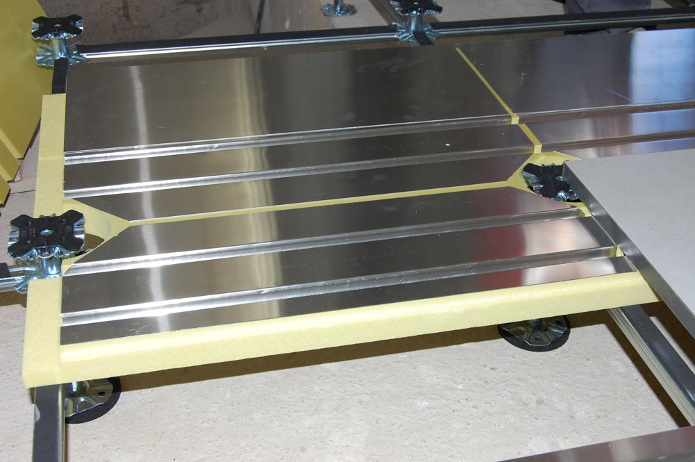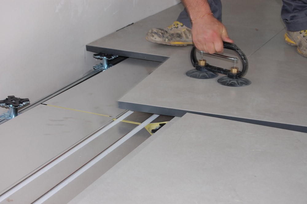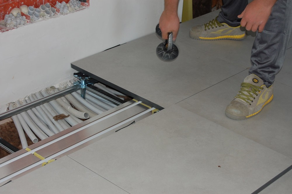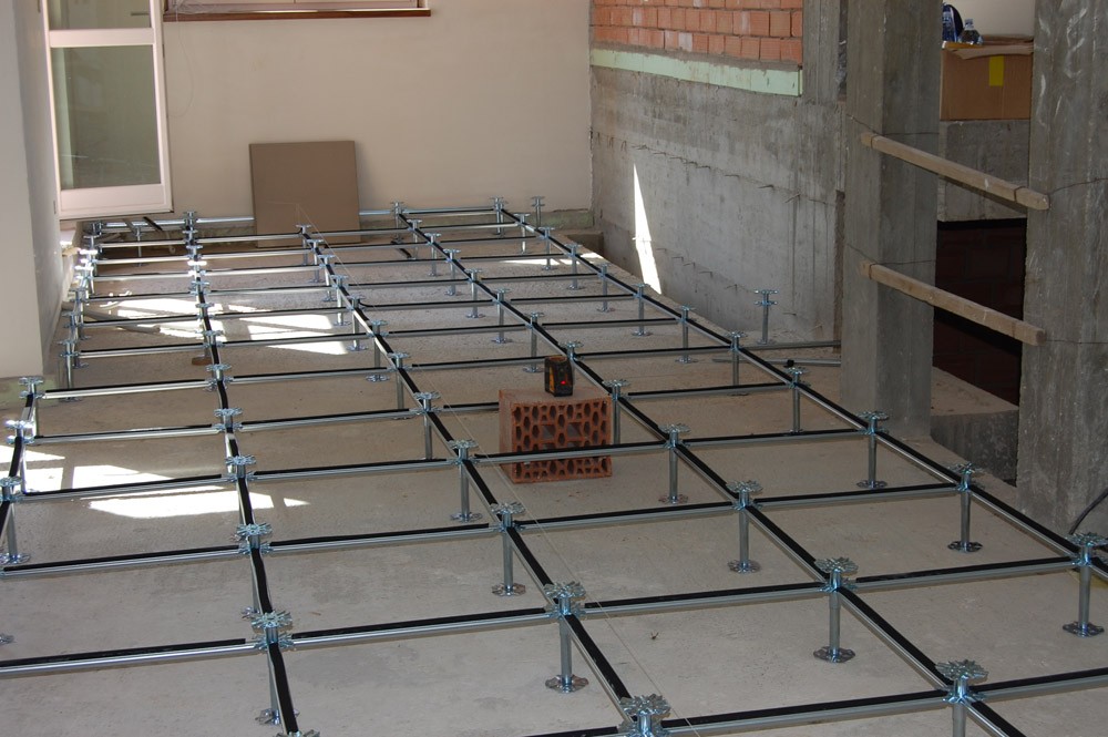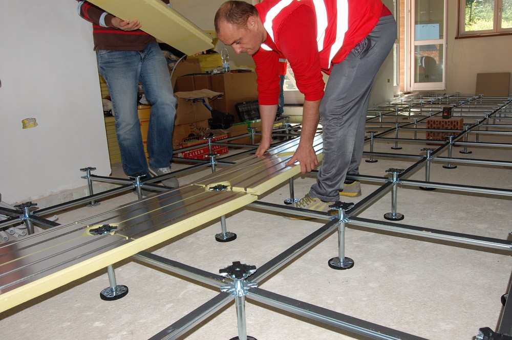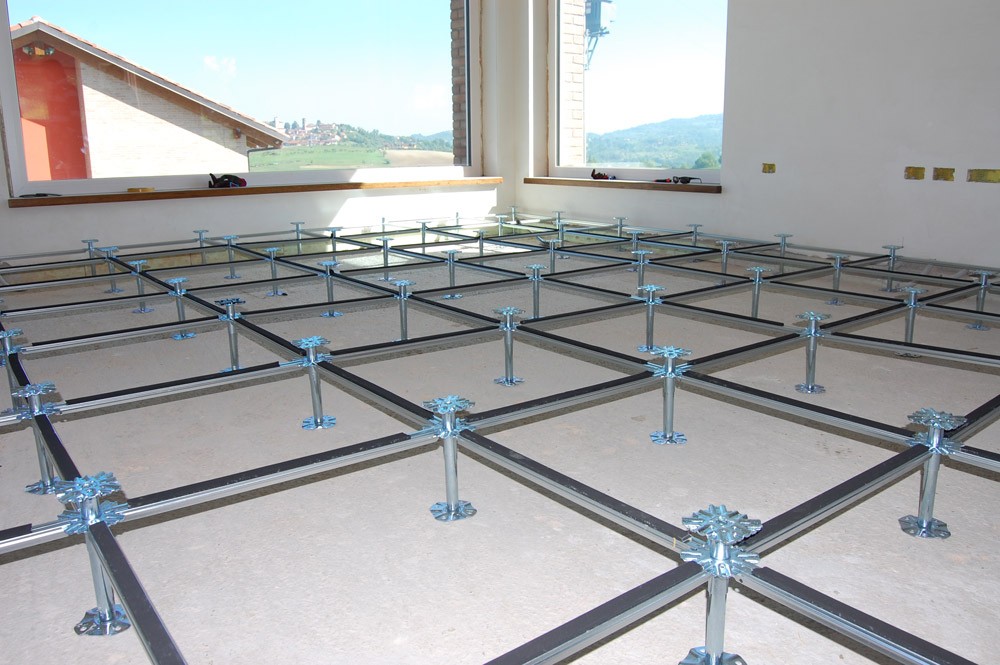 Il sistema così composto viene sopraelevato dalla soletta tramite una speciale struttura regolabile in altezza da 14 a 65 cm al fine di creare un’intercapedine sotto pavimento per raccogliere gli altri impianti di tipo elettrico, idraulico, telefonico, informatico, ecc.